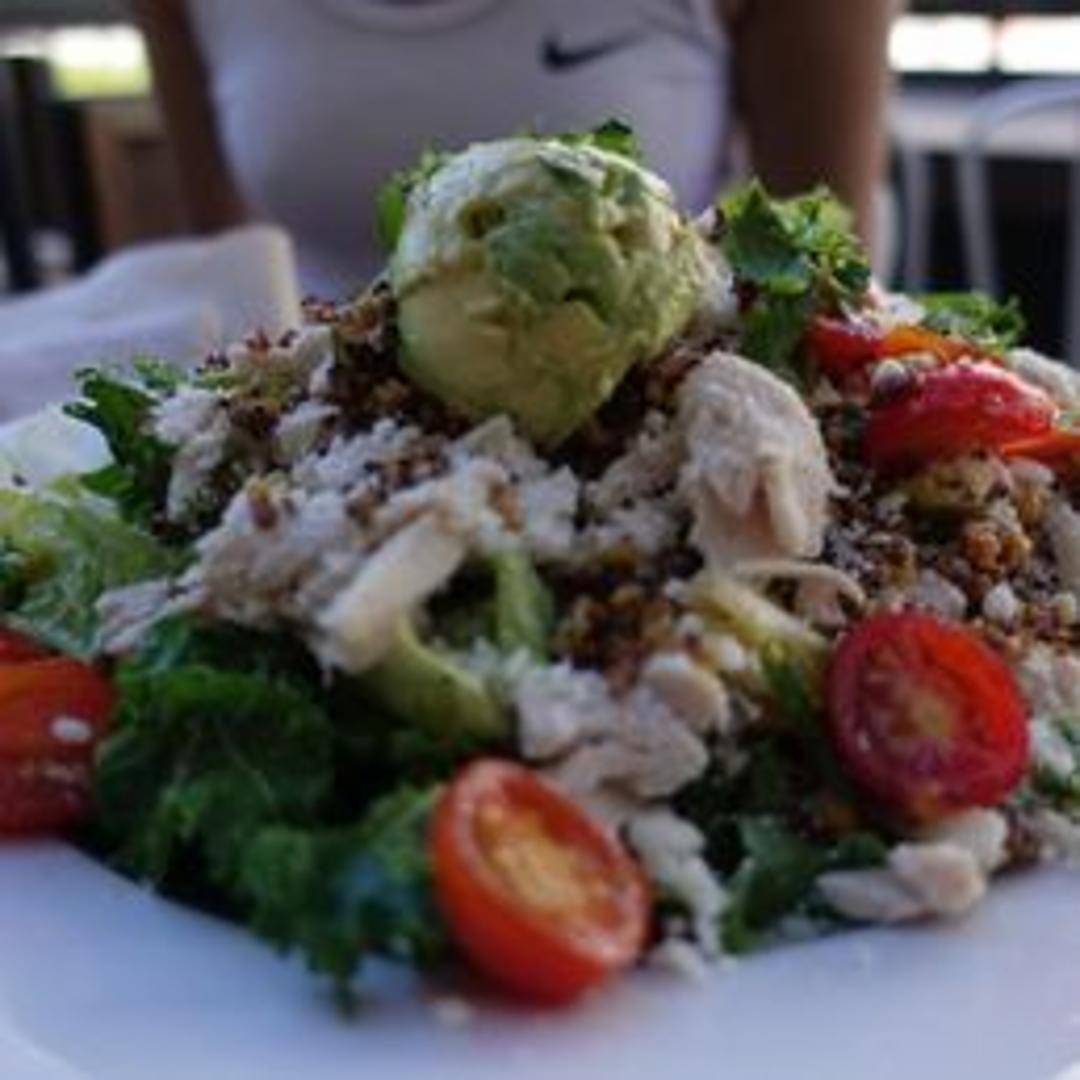 Quinoa, avocado, black beans, corn, roasted red peppers, cilantro, cotija cheese, and a lime-cilantro vinaigrette.