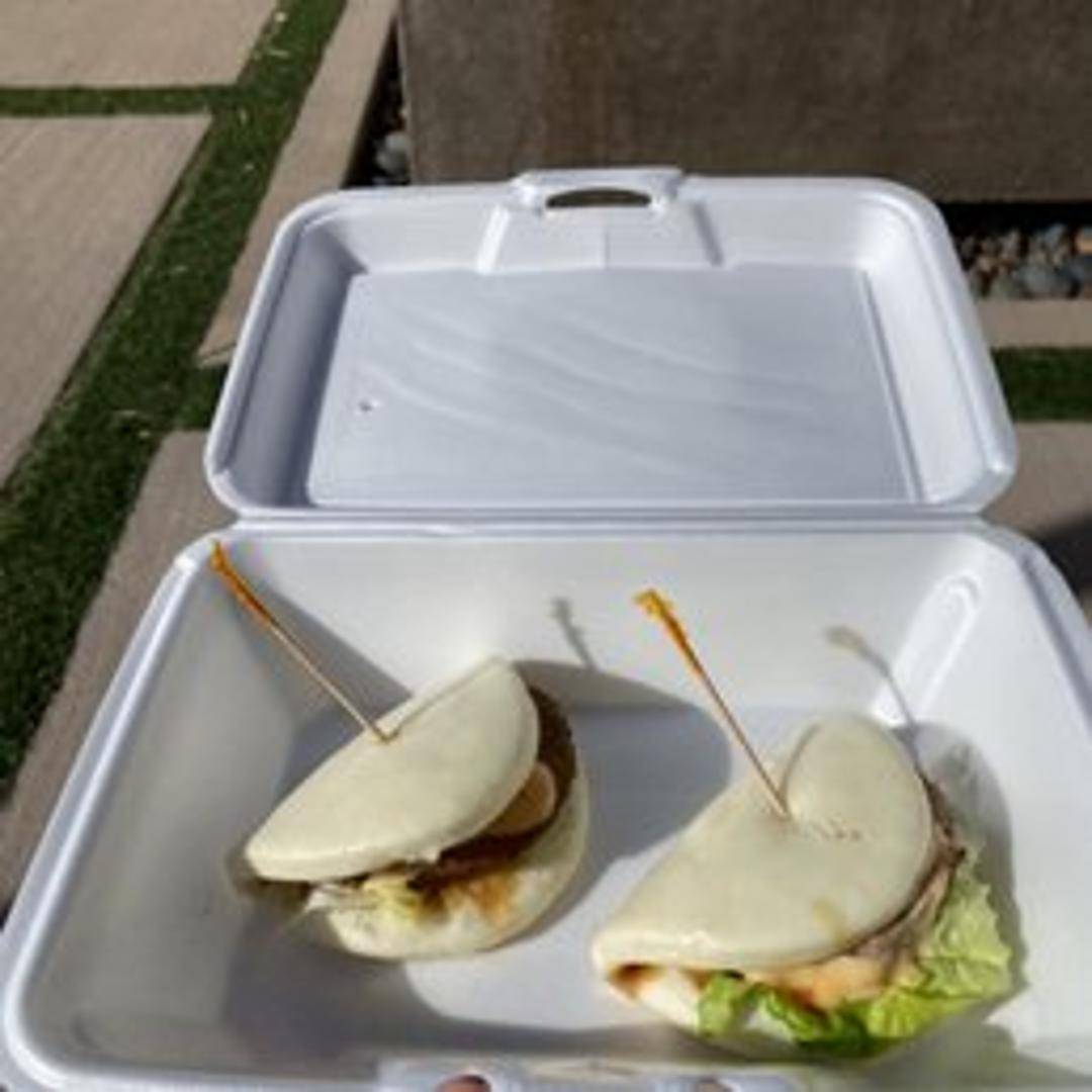 Fluffy steamed bun filled with tender and flavorful pork belly, pickled vegetables, and a sweet and savory sauce.