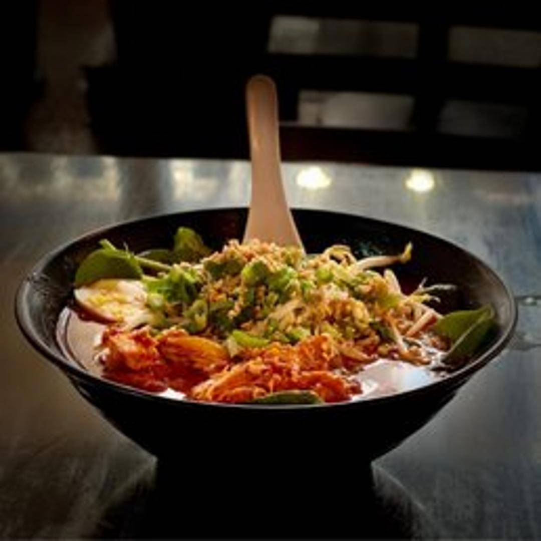 A flavorful ramen featuring a spicy broth and tender pieces of chicken. Served with ramen noodles, seasoned egg, and various toppings that complement the spicy chicken.