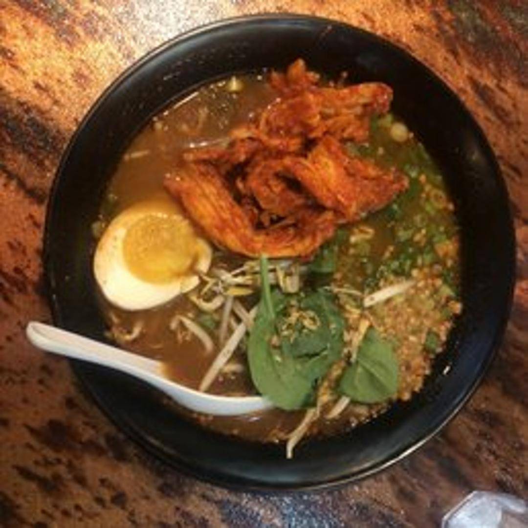 Ramen featuring a flavorful broth with a generous helping of spicy chicken. Served with ramen noodles and various toppings to complement the chicken.