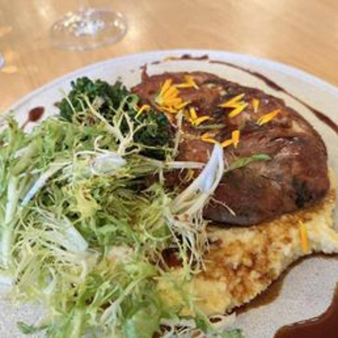 Grilled pork chop served with a seasonal fruit chutney, potato gratin, and sauteed greens. The preparation varies seasonally based on availability.