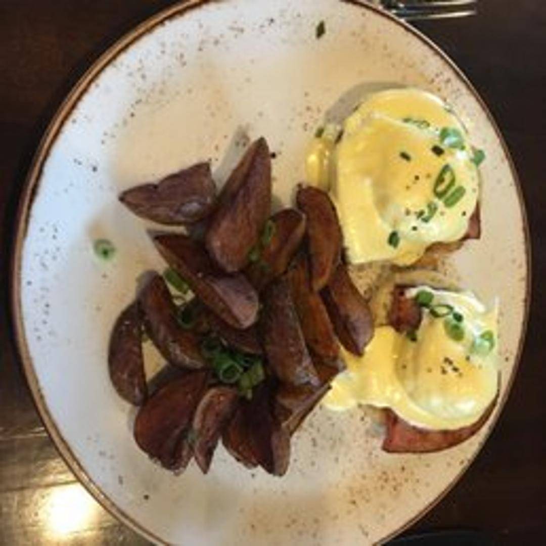 Two poached eggs served atop toasted English muffins with Canadian bacon and hollandaise sauce. Served with a side of breakfast potatoes.