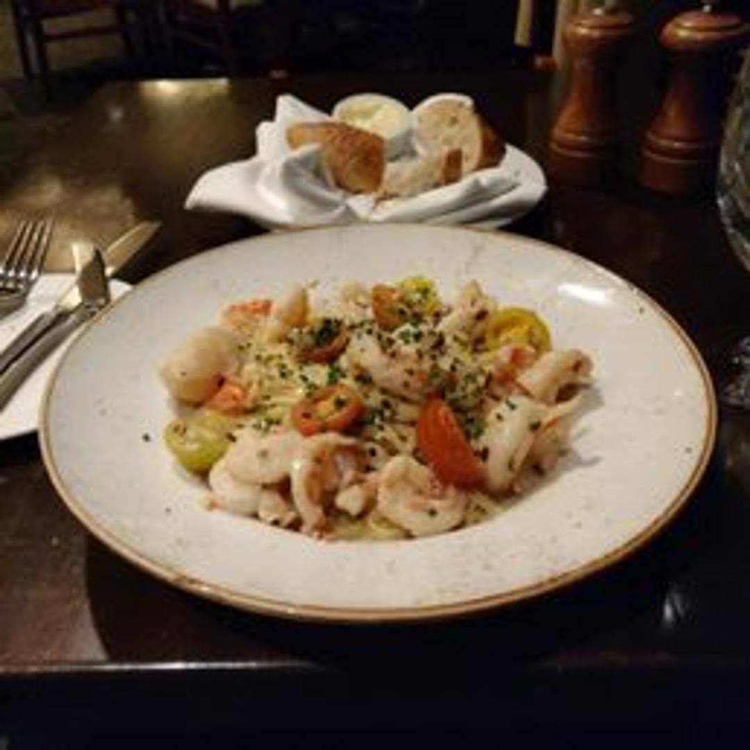 Sautéed shrimp in a garlic butter sauce, served over linguine pasta. Garnished with fresh parsley and Parmesan cheese.