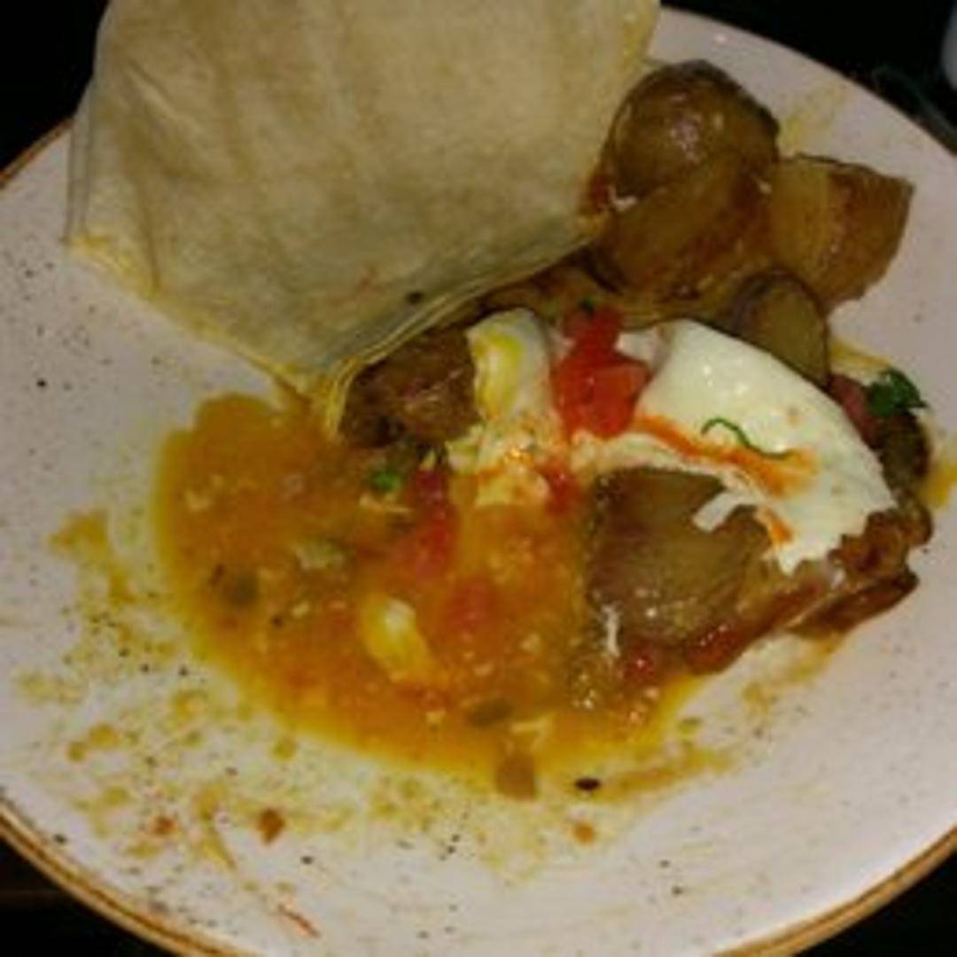Scrambled eggs served in a bowl with a spicy green chili sauce, topped with shredded cheese, diced tomatoes, and a dollop of sour cream. Served with a side of warm tortillas.