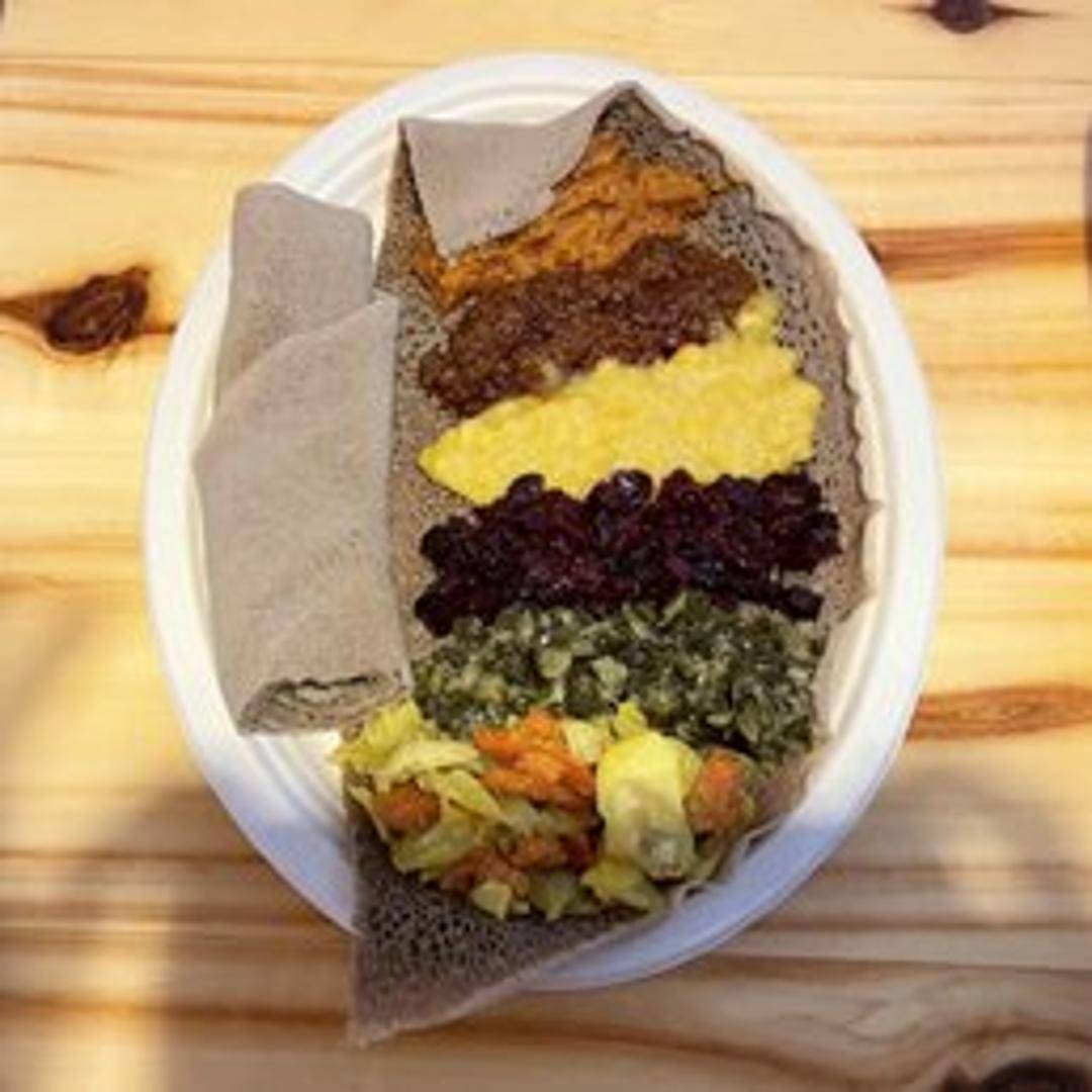 A diverse selection of vegetarian Ethiopian stews and dishes. Includes a variety of flavorful options such as Misir Wot (red lentil stew), Kik Alicha (yellow split pea stew), Gomen (collard greens), and other seasonal vegetable preparations. Served atop injera, providing a well-rounded and satisfying vegetarian meal. The specific dishes may vary.