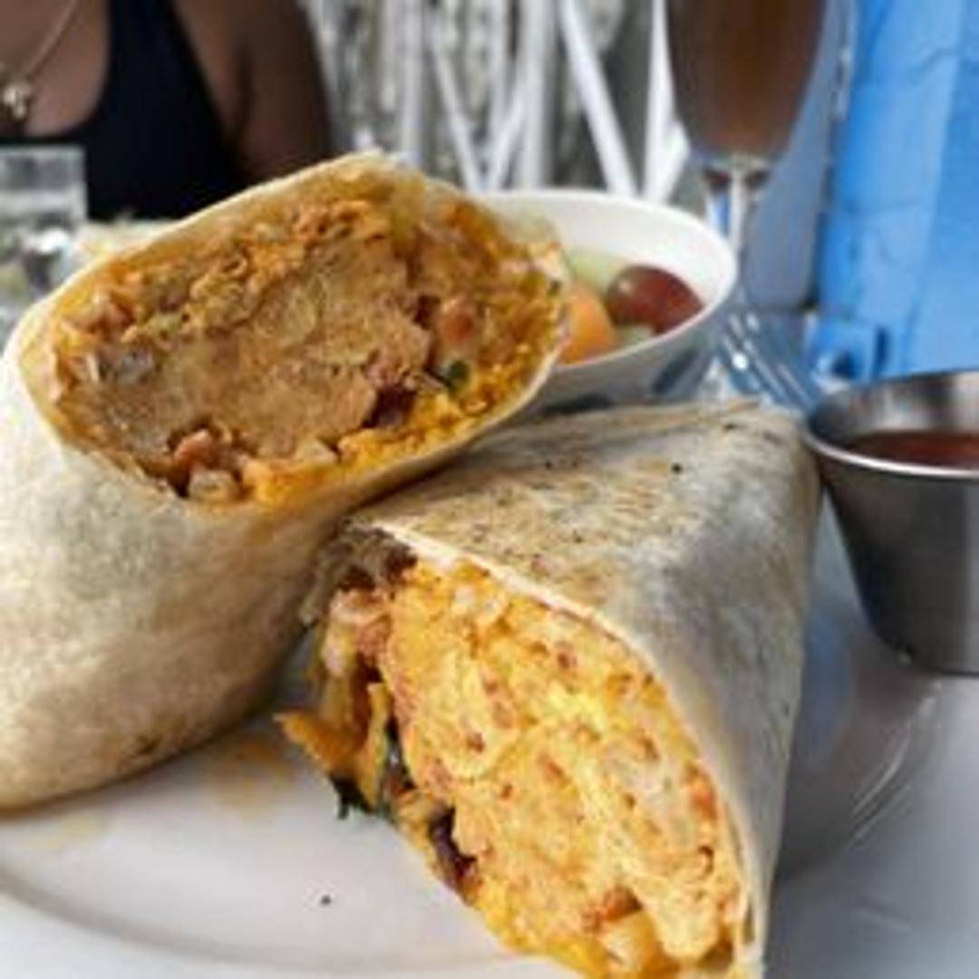 A hearty burrito filled with scrambled eggs, your choice of protein (bacon, sausage, or chorizo), potatoes, cheese, and salsa. Served with a side of sour cream and guacamole.