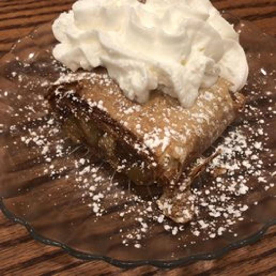 Flaky pastry filled with a sweet and tart apple mixture, seasoned with cinnamon and spices. Served warm, often with vanilla sauce or whipped cream.
