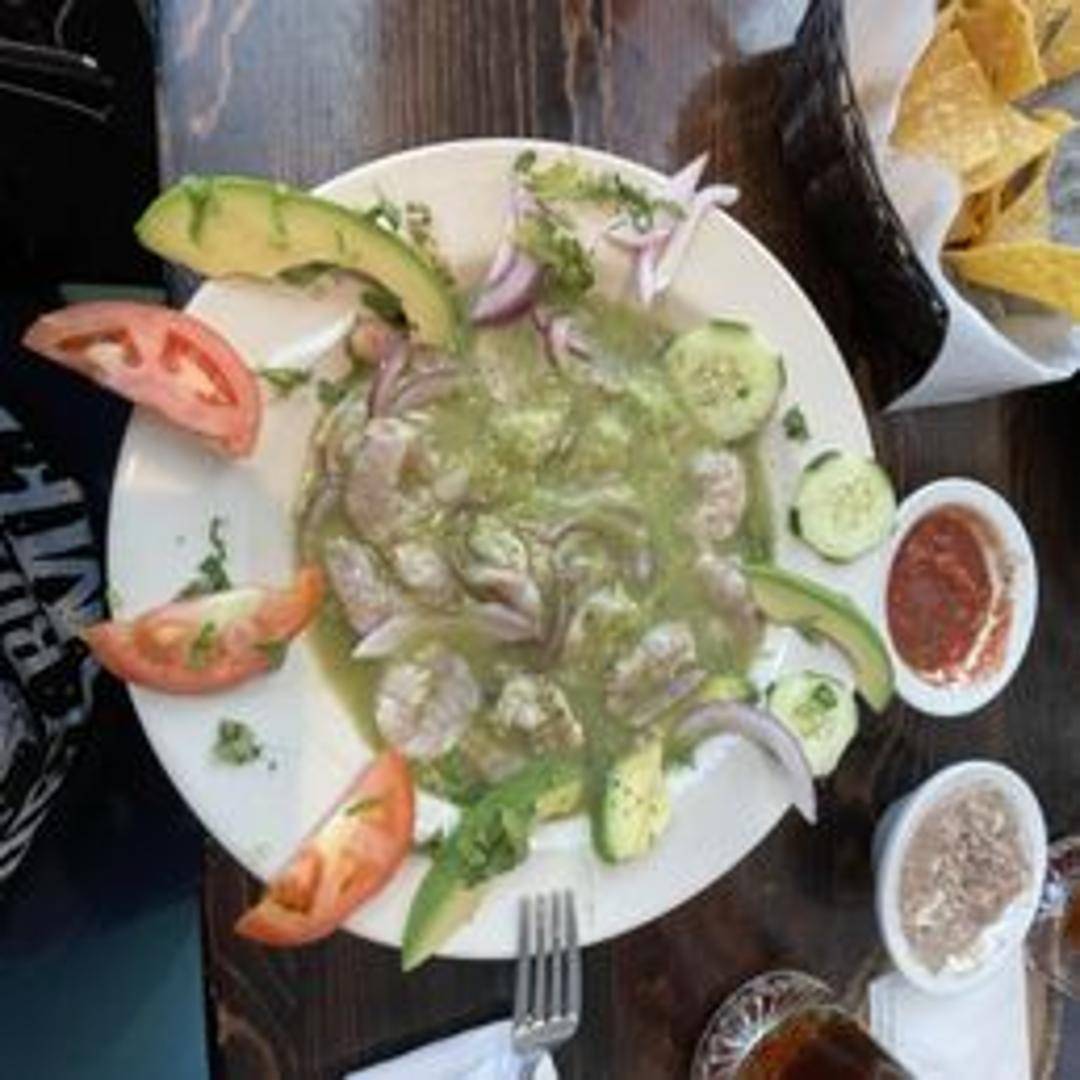 Shrimp marinated in lime juice, chilies, cilantro, and cucumber, typically served cold and spicy.