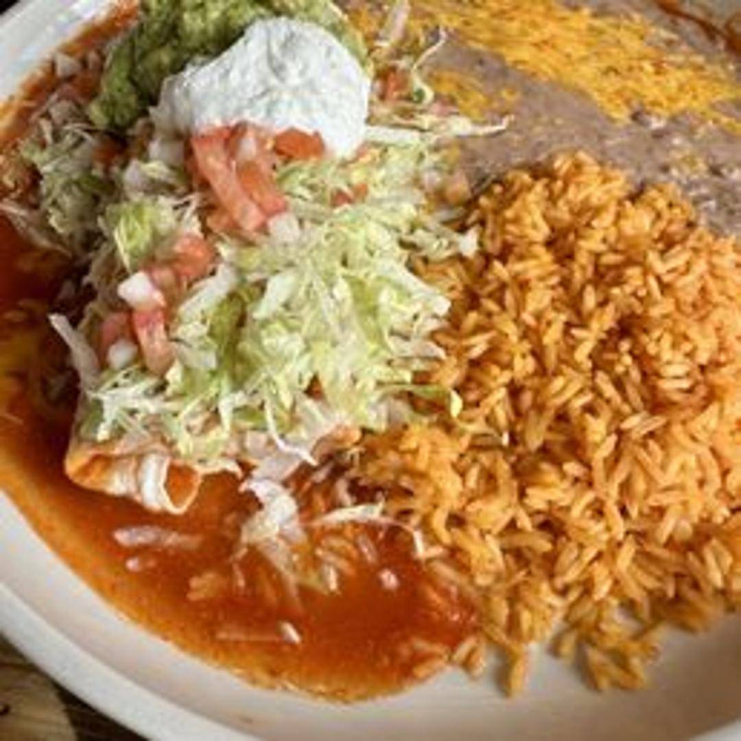 A large flour tortilla filled with your choice of meat, rice, beans, lettuce, tomato, sour cream, and guacamole. Often smothered in your choice of sauce.