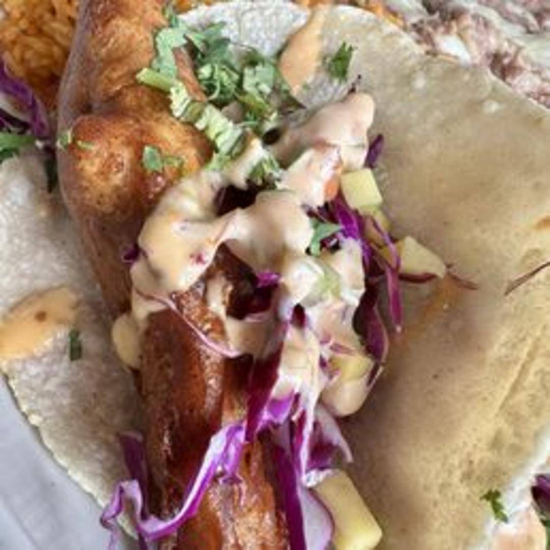 A single soft taco filled with seasoned and grilled or fried fish, typically topped with shredded cabbage, pico de gallo, and a creamy white sauce.