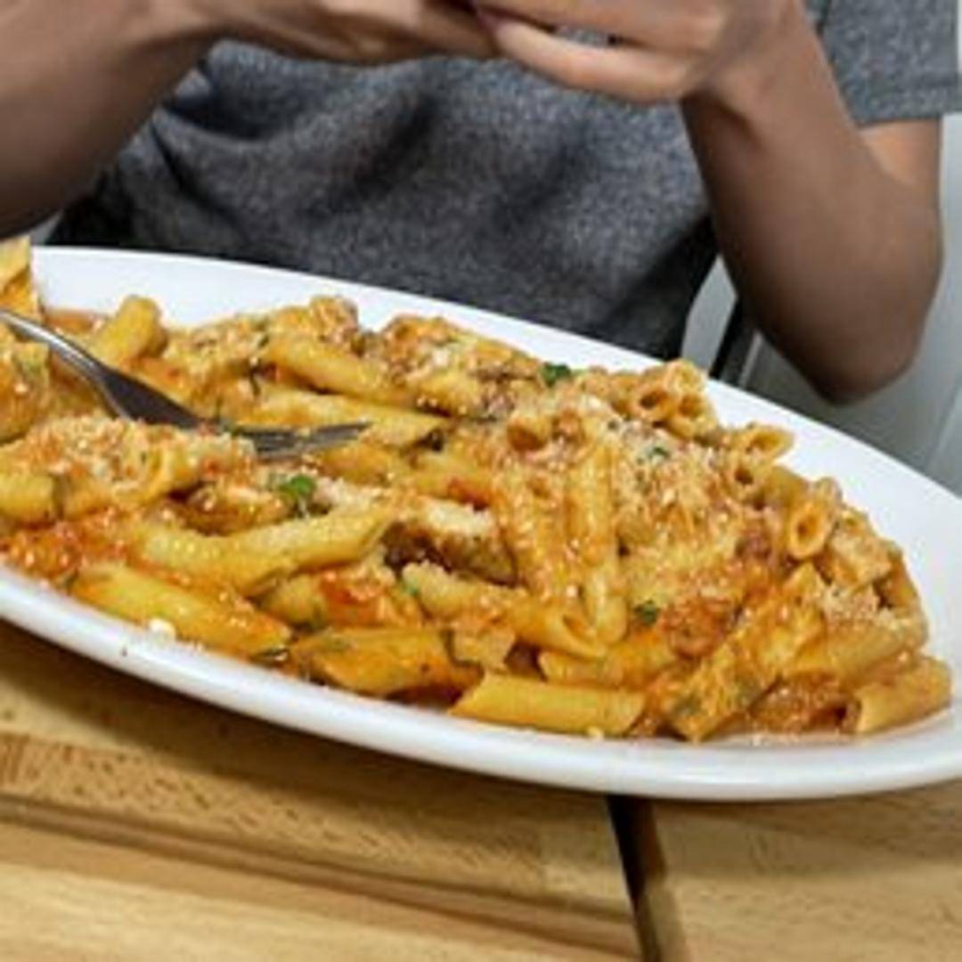 Penne pasta tossed in a creamy tomato sauce infused with vodka. This dish features a rich and smooth texture with a subtle hint of tomato sweetness, perfectly balanced with the savory notes of parmesan cheese and aromatic herbs.