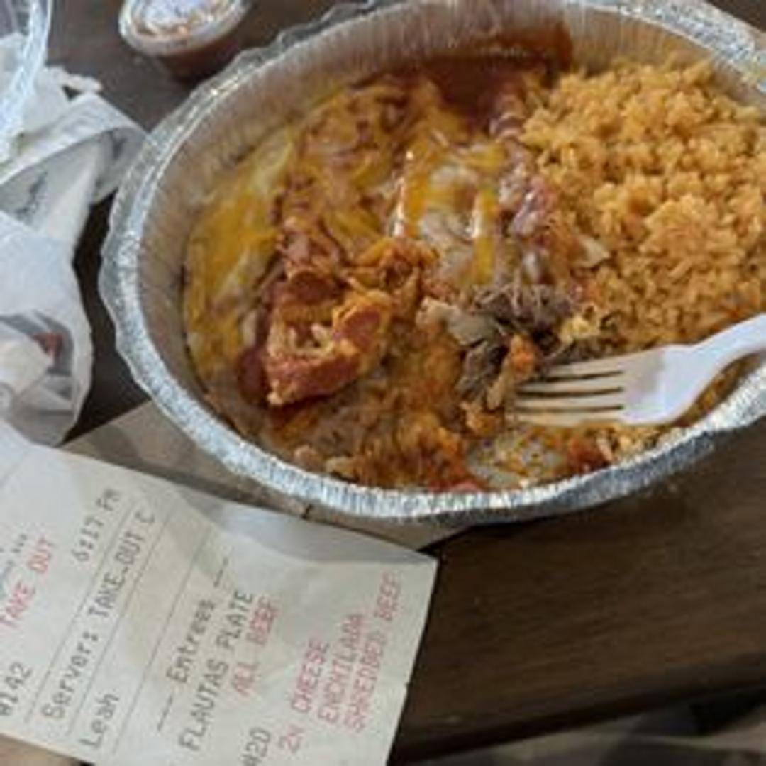 Two corn tortillas filled with cheese, smothered in your choice of red or green enchilada sauce and melted cheese. Served with rice and beans.