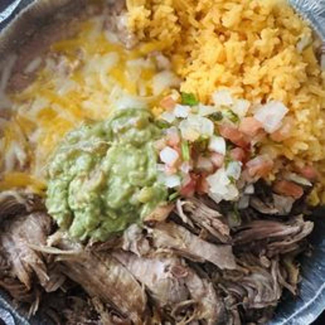 Flavorful, slow-cooked pulled pork (carnitas) served with rice, beans, guacamole, pico de gallo, and your choice of tortillas.