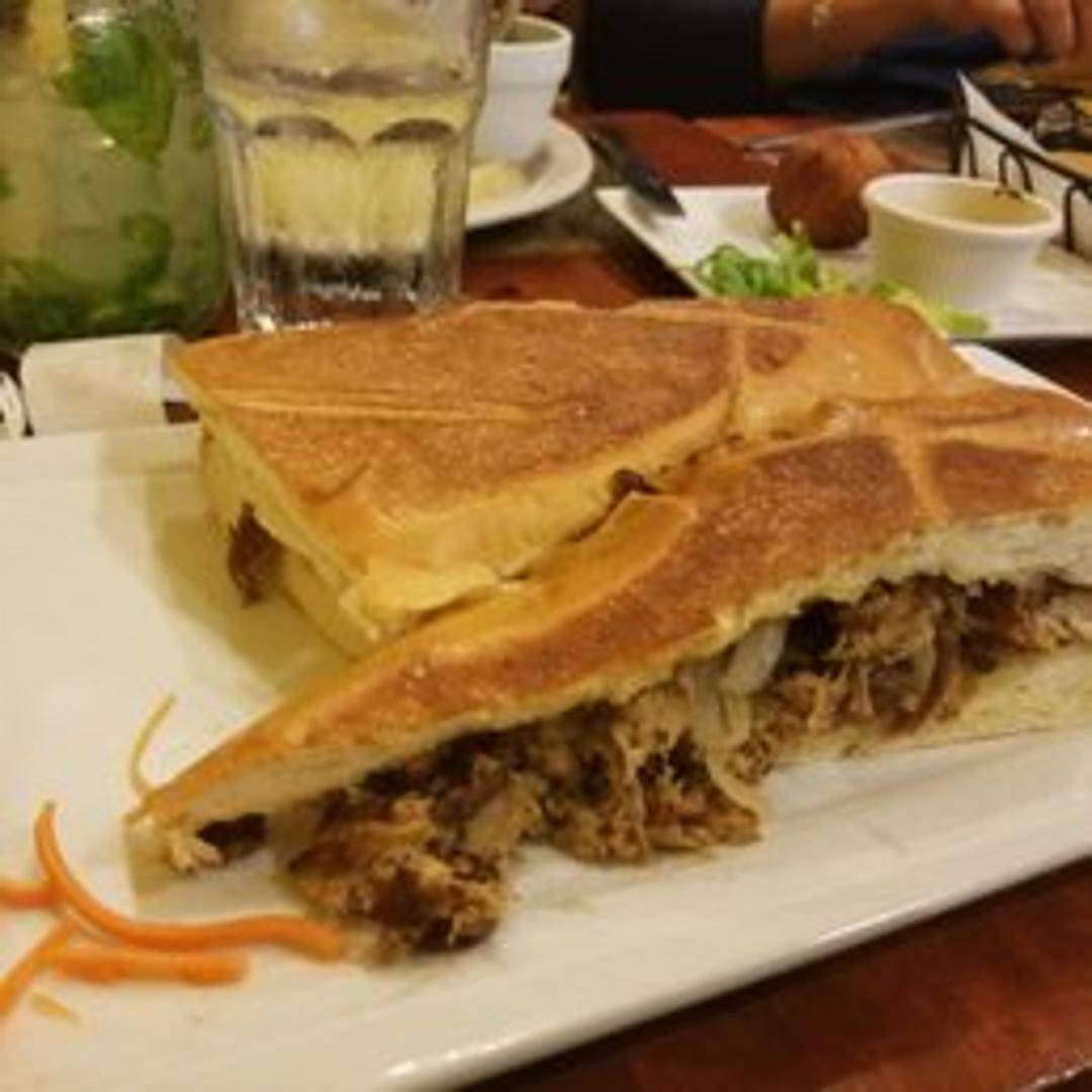 Experience a true Cuban delight with our Pan Con Lechon. This hearty sandwich features succulent, slow-roasted pork (lechon), marinated in traditional Cuban spices and mojo, piled high on toasted Cuban bread, and topped with grilled onions. A flavorful and satisfying classic.