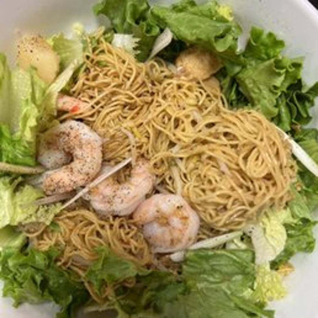 A hearty and flavorful dry noodle dish, also known as Mì Khô. This dish features chewy egg noodles tossed in a special house savory sauce, often accompanied by slices of char siu pork, shrimp, and crisp vegetables like bok choy or bean sprouts. A small bowl of clear broth is served on the side, perfect for sipping or adding to moisten the noodles to your preference.
