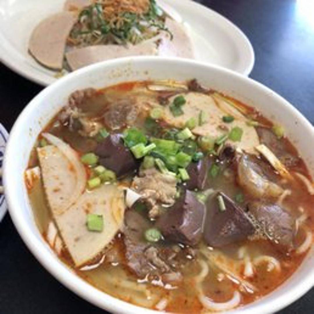 A robust and flavorful Vietnamese noodle soup boasting a spicy and aromatic beef broth, tender slices of beef, and thick rice vermicelli noodles. This hearty dish is generously garnished with fresh herbs, onions, and often includes a touch of chili oil for an extra kick, offering a bold and invigorating culinary experience.