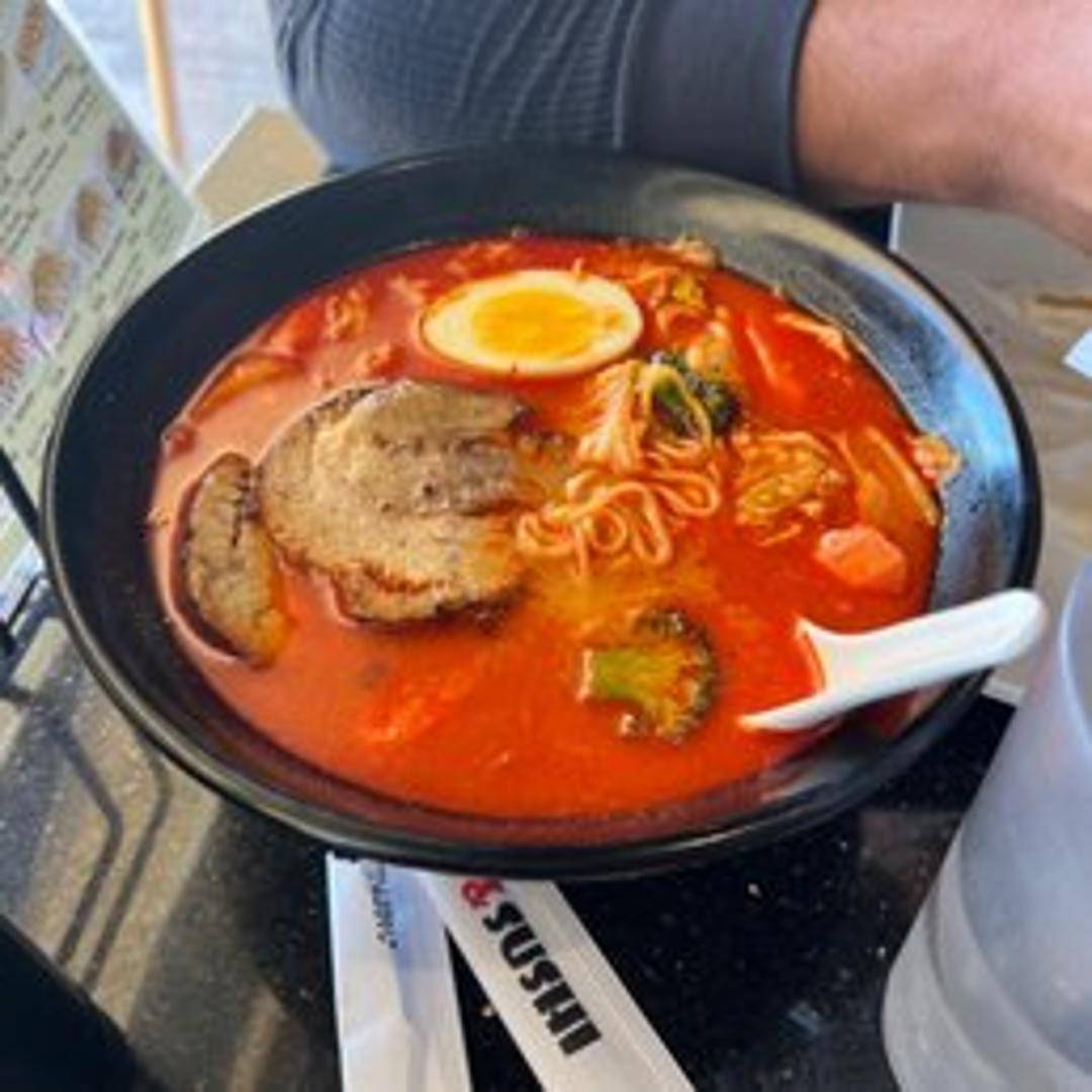 Ramen noodles in a flavorful broth, topped with spicy pork (often ground or sliced), vegetables (like bean sprouts, green onions, and seaweed), and a soft-boiled egg. The broth will have a noticeable spicy kick.