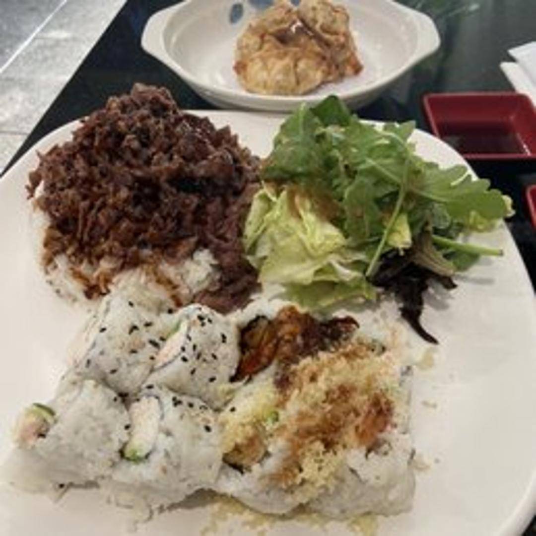 Grilled or stir-fried beef glazed with teriyaki sauce, served with a side salad and a portion of rice. The salad usually includes mixed greens with a light dressing.
