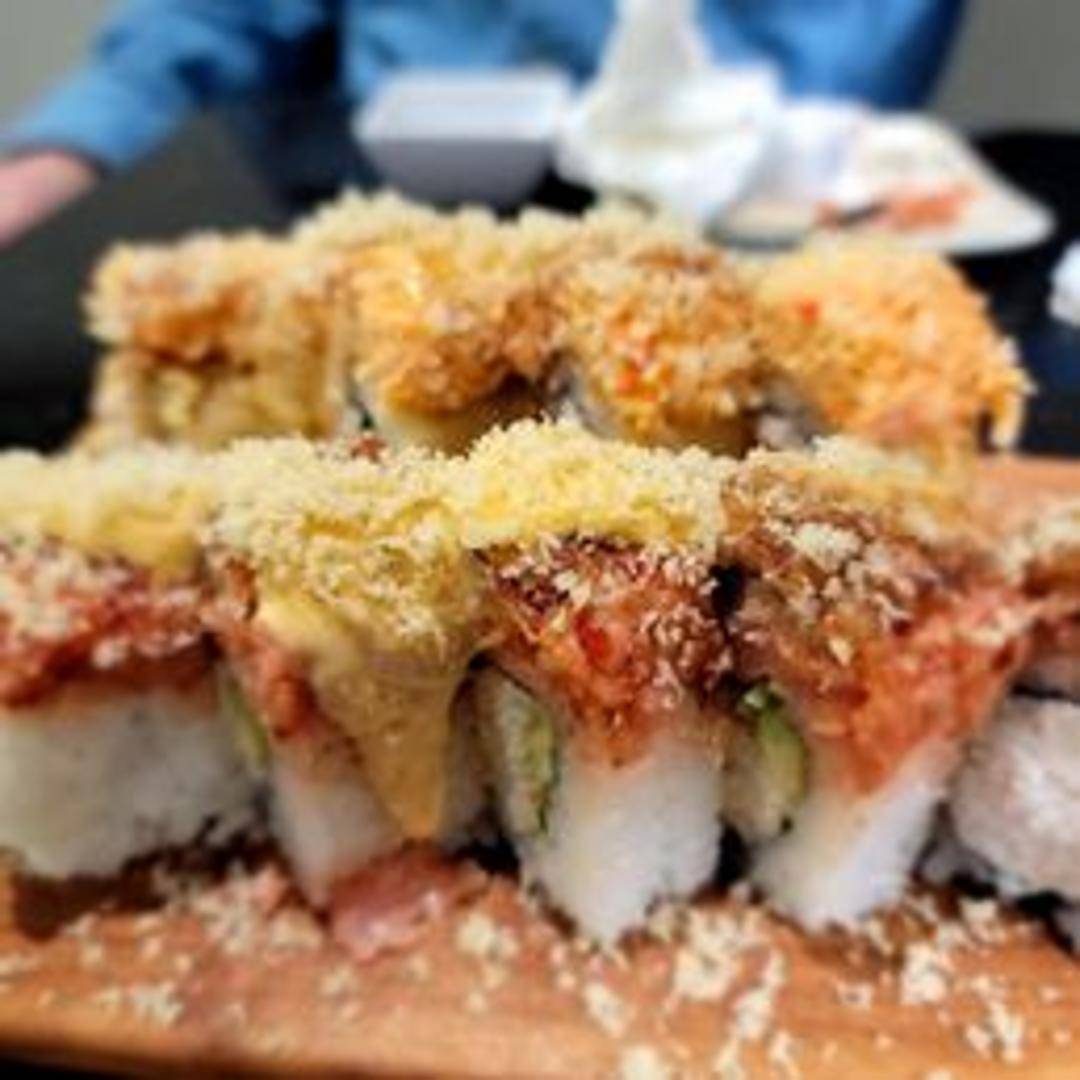 A large sushi roll featuring tempura shrimp or other tempura elements. Often includes avocado, cucumber, and a sauce such as eel sauce or spicy mayo. May be deep fried.