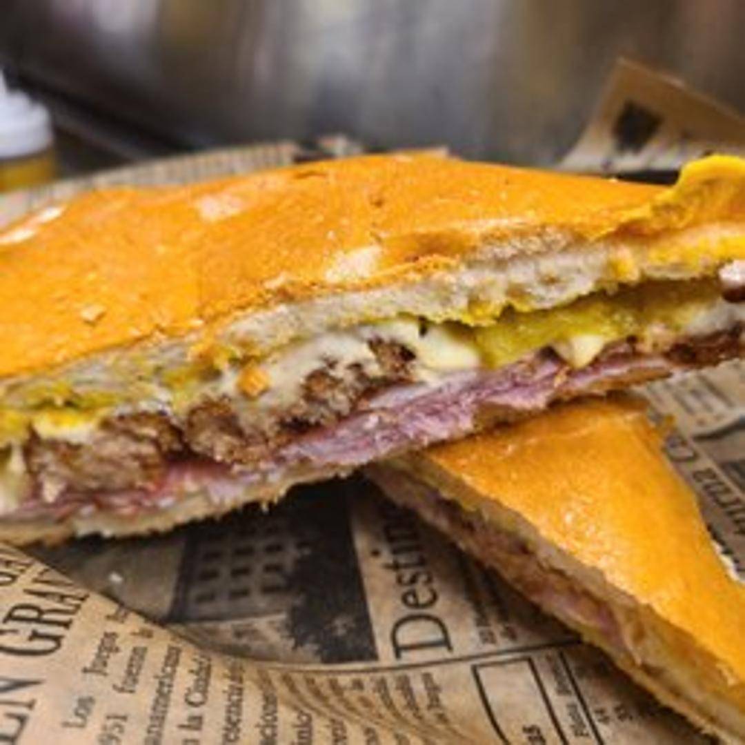Experience the authentic taste of Miami Fusion Cafe's Cuban Sandwich, a masterful blend of flavors featuring slow-roasted mojo pork, thinly sliced sweet ham, melted Swiss cheese, tangy dill pickles, and a smear of yellow mustard, all pressed between slices of crispy, toasted Cuban bread until golden brown and delicious.