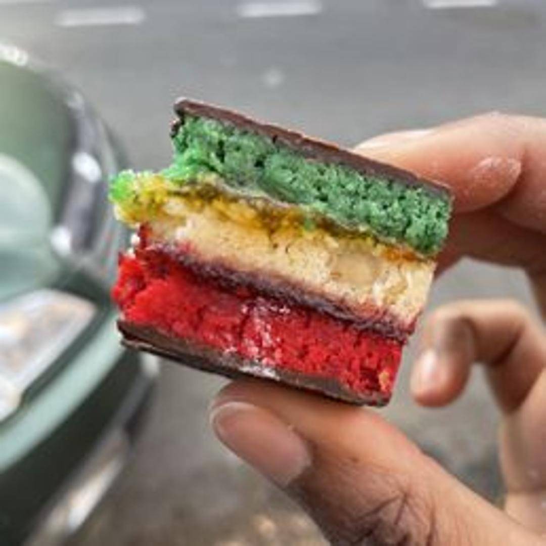 A tri-layered almond sponge cake, dyed vibrant colors (typically red, yellow, and green), sandwiched together with apricot jam and covered in a rich chocolate coating.