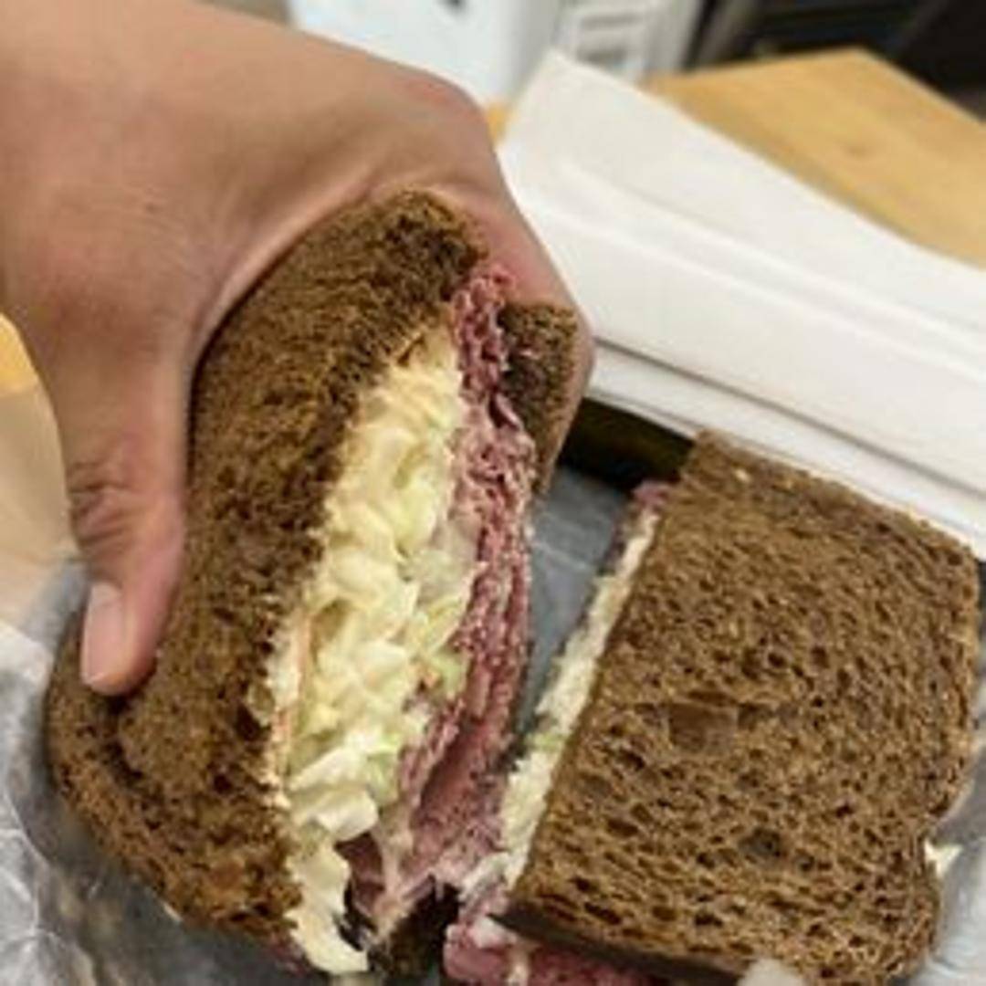 A classic deli sandwich featuring thinly sliced, tender corned beef, tangy sauerkraut, melted Swiss cheese, and creamy Russian dressing, all piled high on grilled rye bread. A flavorful and satisfying lunchtime staple.