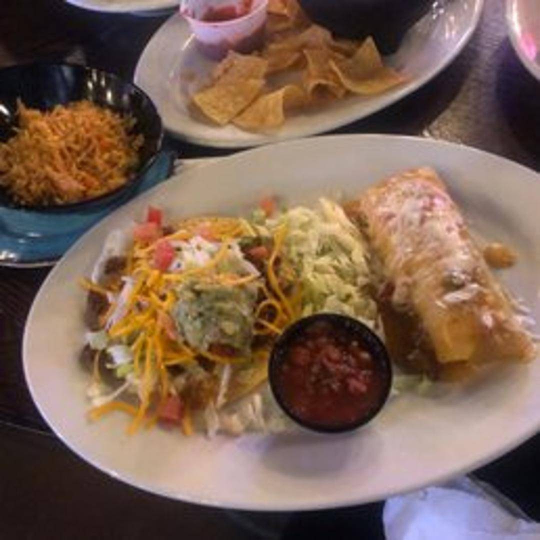 A corn tortilla rolled around a savory filling, typically cheese, meat, or beans, and smothered in a flavorful chili sauce. Served with your choice of side.