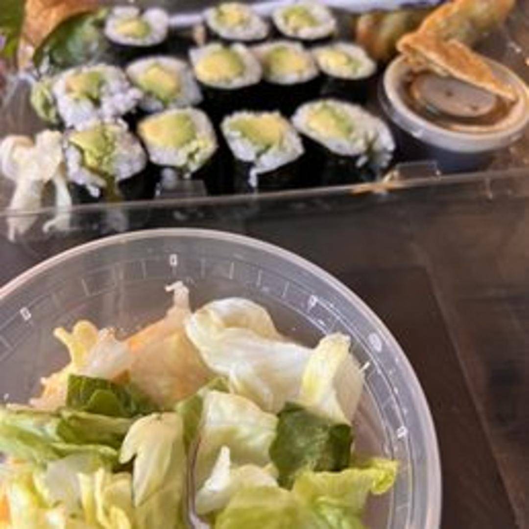 Avocado rolled in seasoned sushi rice and nori seaweed.