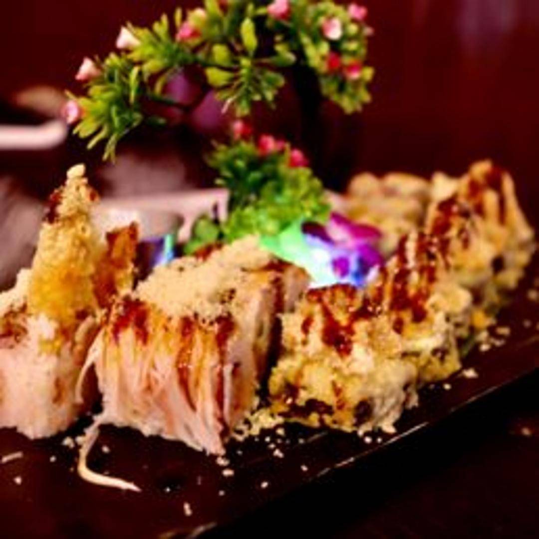 A spicy roll containing shrimp tempura, avocado, and cucumber. Topped with spicy tuna, eel sauce, and crunchy flakes.
