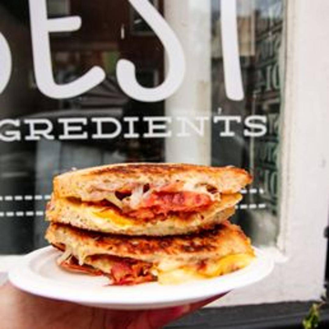 Fried egg, bacon, cheese, and avocado on toasted Iggy's challah bread.