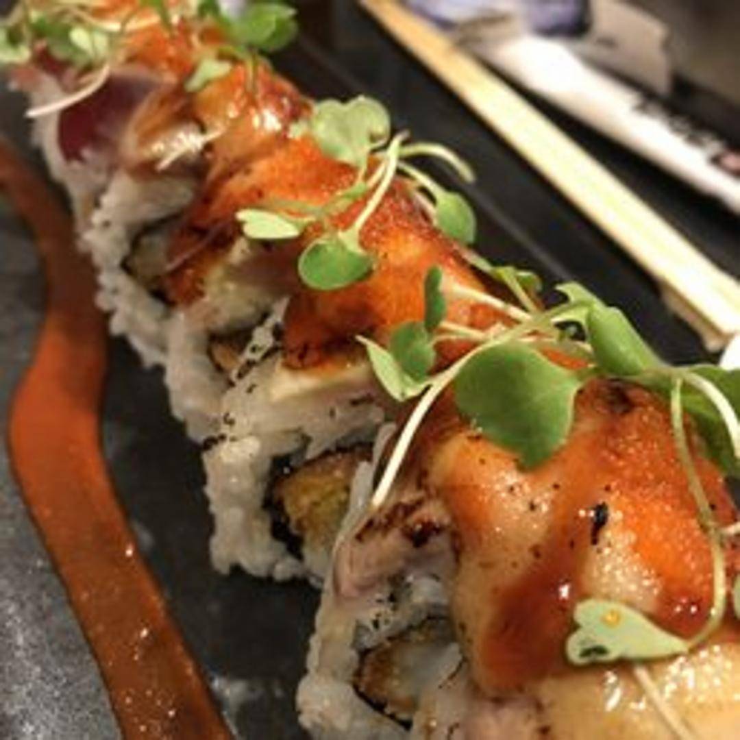 A vibrant sushi roll featuring spicy tuna, avocado, and cucumber, topped with a colorful assortment of tobiko and a drizzle of spicy mayo.