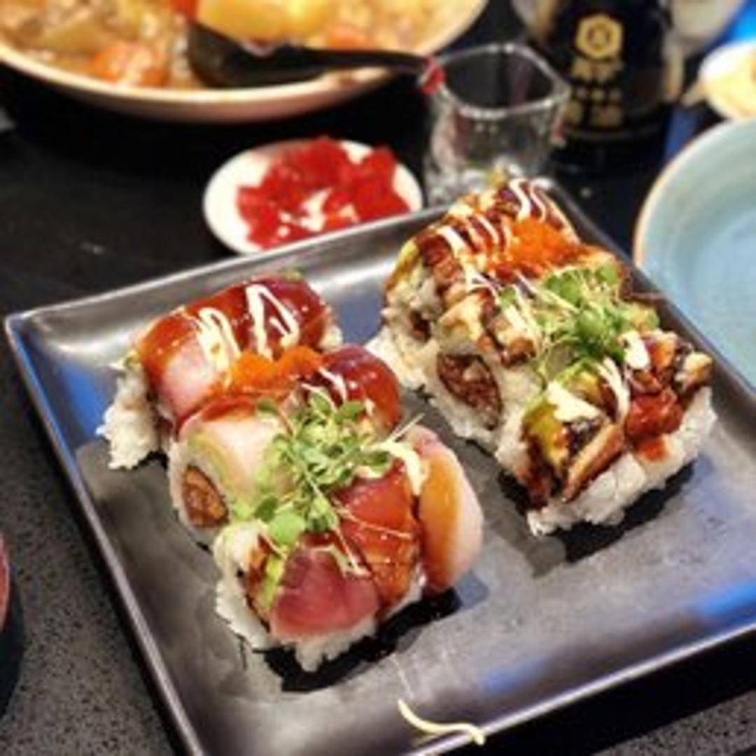 A specialty roll, likely containing a mix of seafood (such as tuna, salmon or shrimp), avocado, cucumber and potentially a sweet or spicy sauce, designed to offer a harmonious blend of textures and tastes.