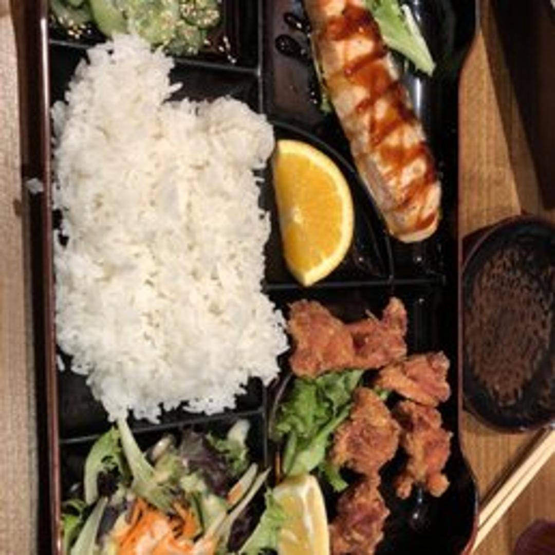 A balanced meal featuring a variety of Japanese dishes, typically including a main course (like teriyaki chicken or salmon), rice, assorted tempura, California roll, and fresh fruit. Perfect for a sample of Mikuni's offerings.
