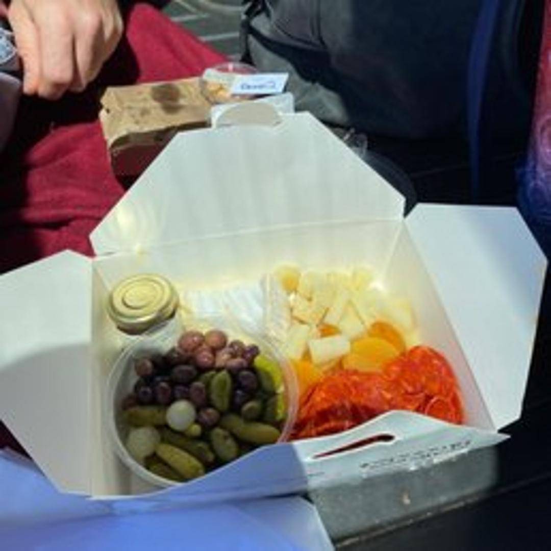 A curated selection of gourmet cheeses, charcuterie, artisanal breads, seasonal fruits, olives, and other delectable accompaniments, all packed in a charming basket. Perfect for enjoying a delightful outdoor meal. Includes napkins and utensils. Contents may vary seasonally.
