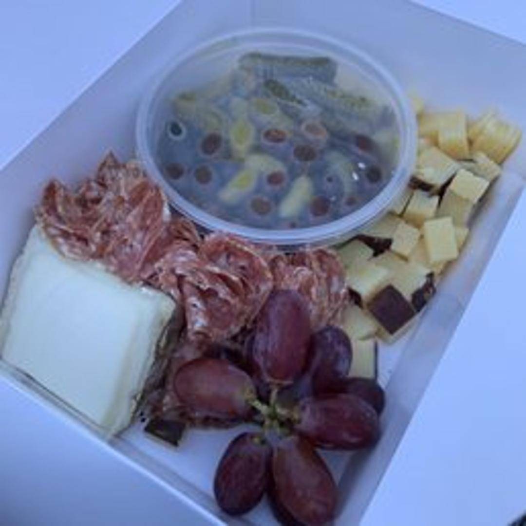 An individual serving of curated cheeses, charcuterie, artisanal breads, seasonal fruits, olives, and other delectable accompaniments in a convenient, ready-to-enjoy box. Ideal for a personal picnic or a quick, elevated lunch. Contents may vary seasonally.