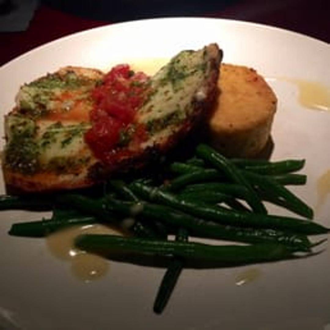 Fresh North Carolina trout roasted to perfection and topped with a vibrant arugula and pecan pesto. The dish highlights the natural flavors of the trout complemented by the peppery arugula and nutty pecan pesto.