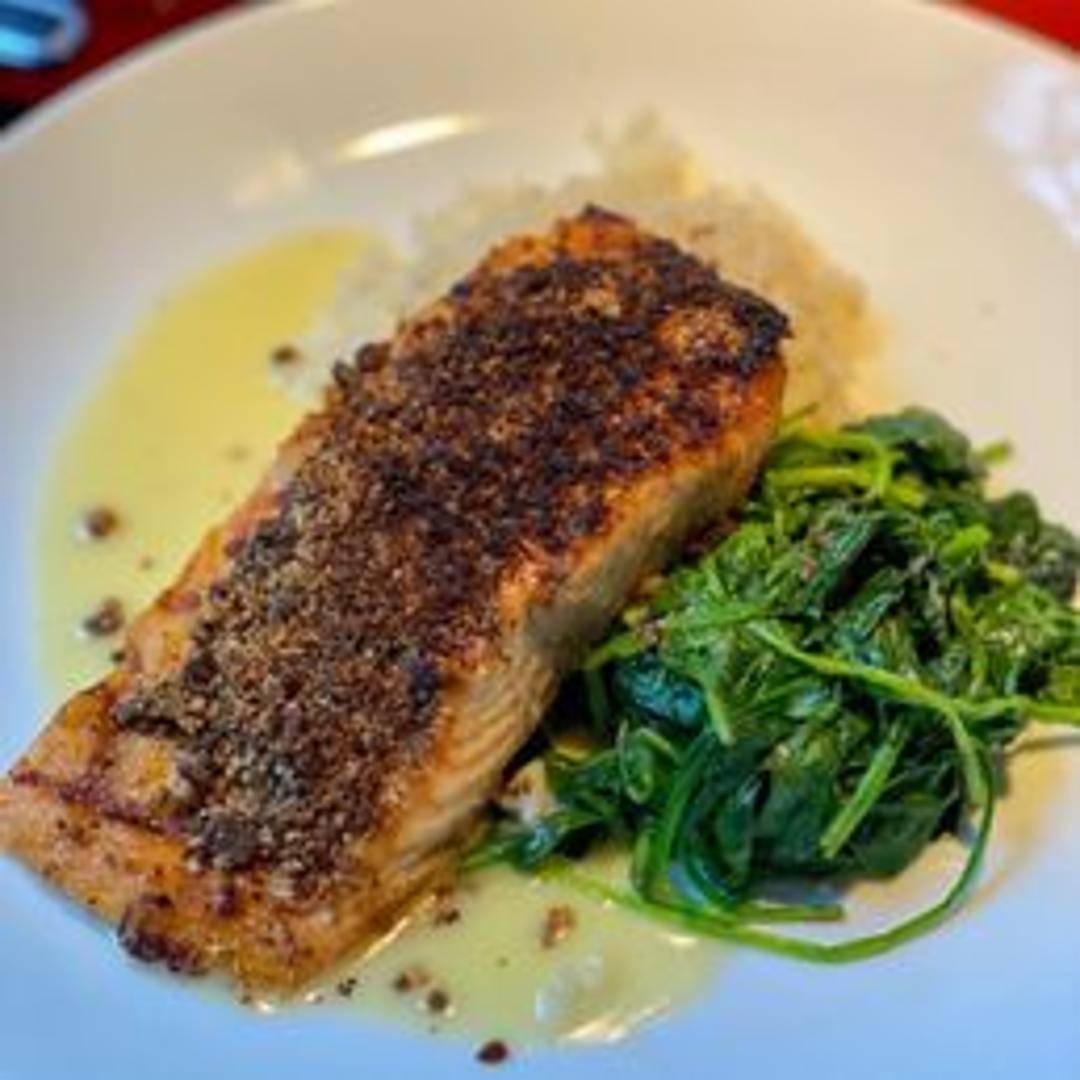 Fresh salmon fillet encrusted with toasted pecans, pan-seared to a golden brown. Served with seasonal vegetables and a complementary sauce.