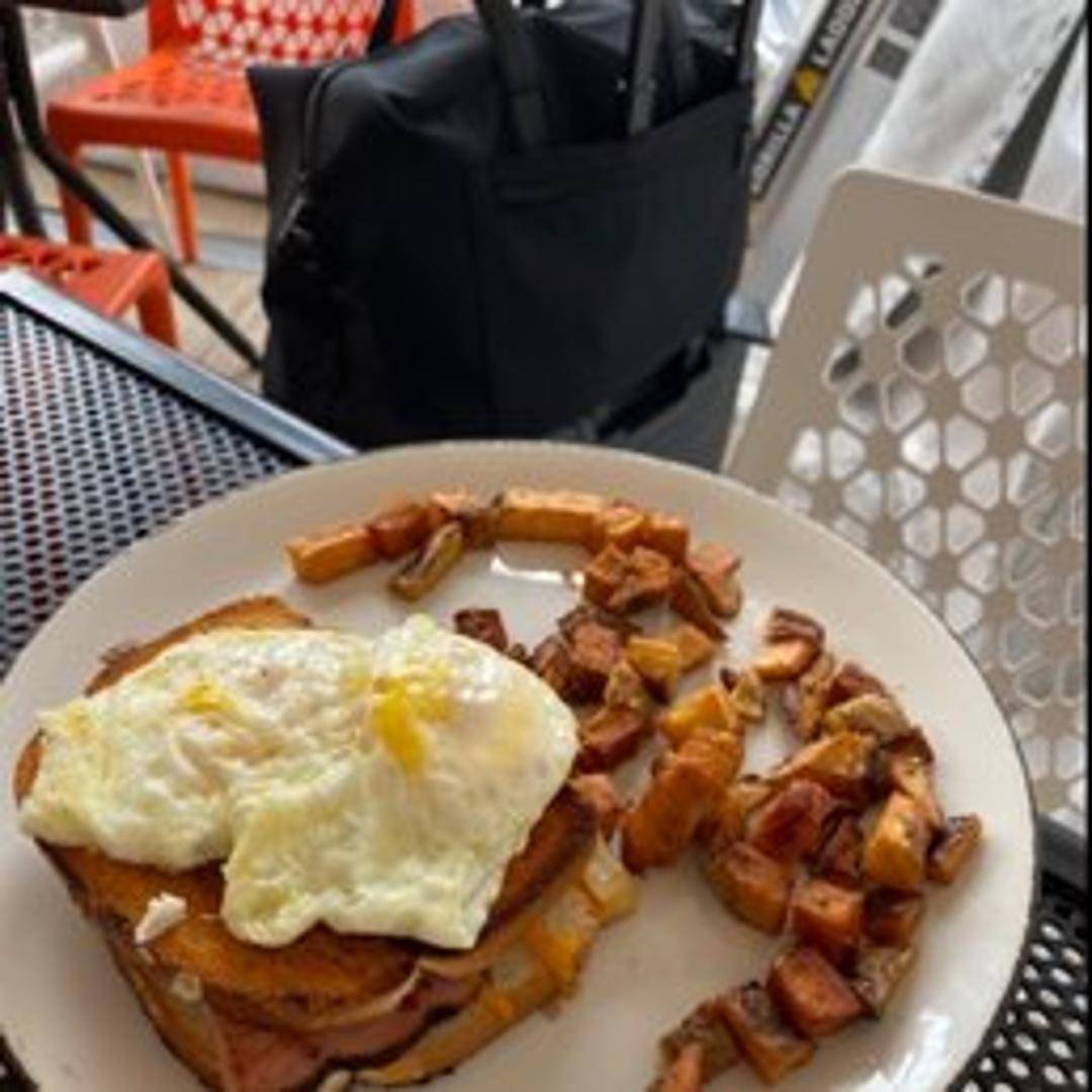 A hearty breakfast sandwich smothered in green chili, filled with your choice of breakfast meats, egg, and cheese on a toasted bun.
