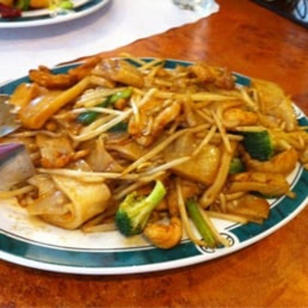 Wide, flat rice noodles stir-fried with tender chicken, crisp vegetables (such as bean sprouts, onions, and scallions), and a savory sauce.