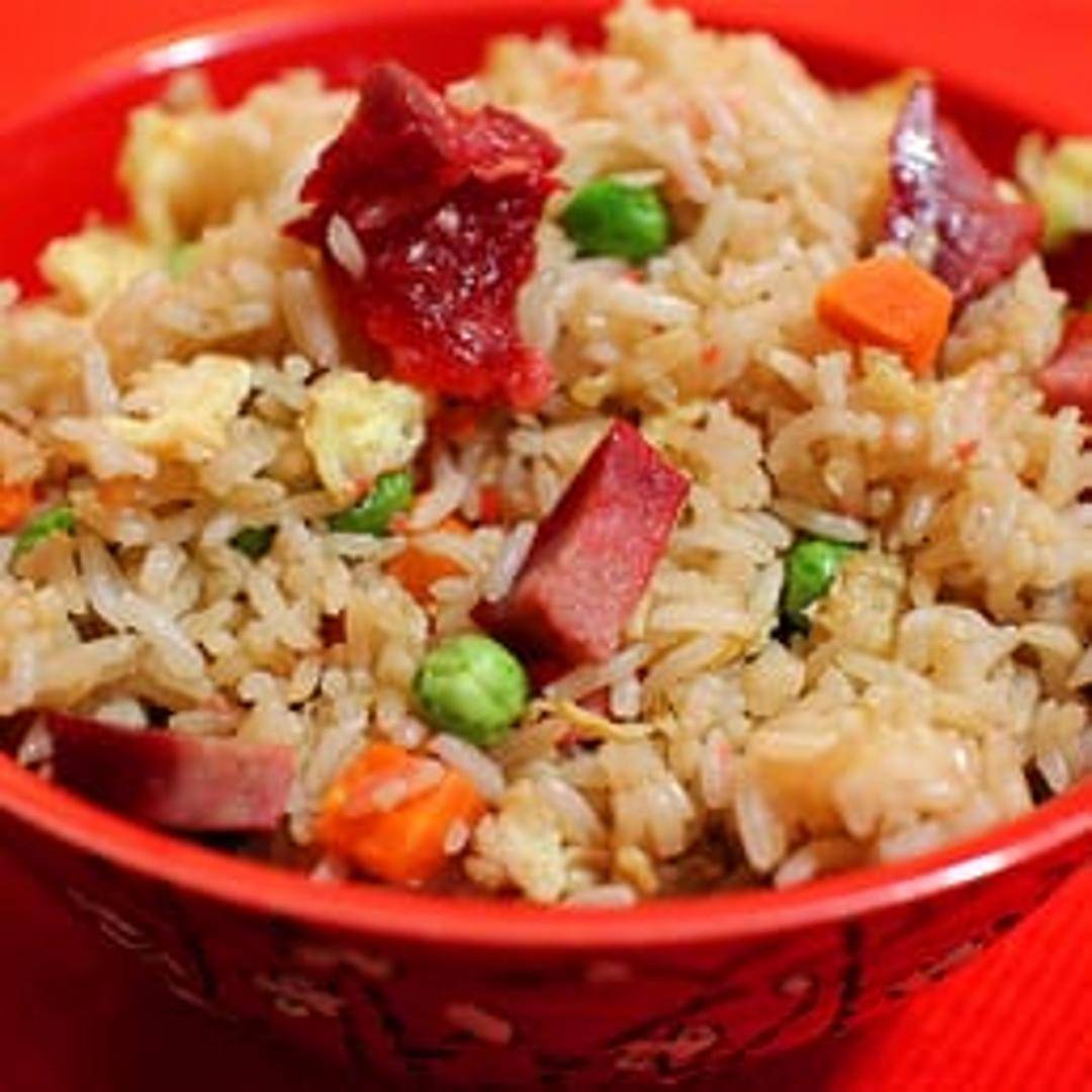 Wok-tossed fried rice with diced BBQ pork (char siu), eggs, peas, carrots, onions, and soy sauce.