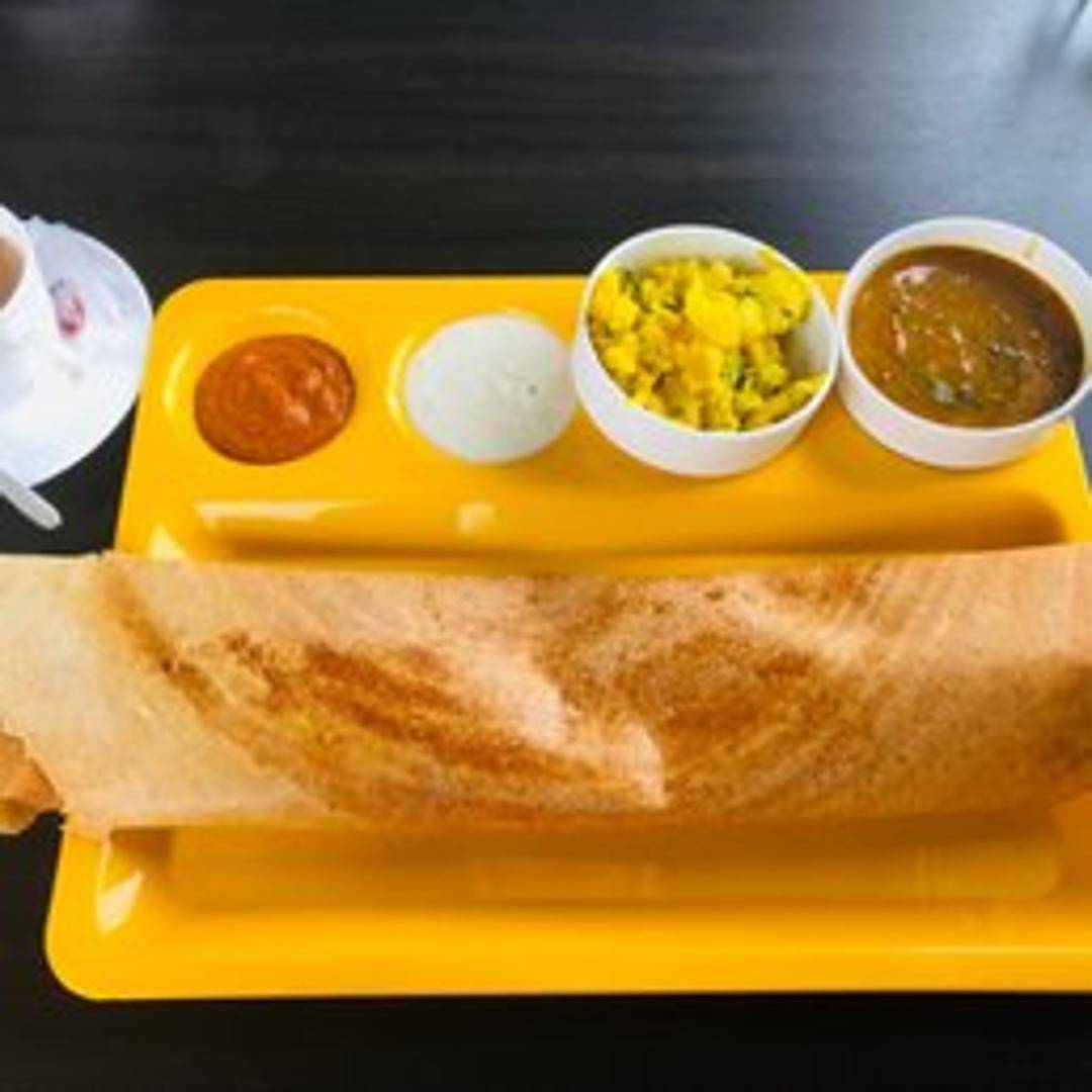 A crispy, thin crepe made from fermented rice and lentil batter, spread with a spicy Mysore chutney and filled with a savory potato and vegetable mixture. Served with sambar (lentil-based vegetable stew) and coconut chutney.