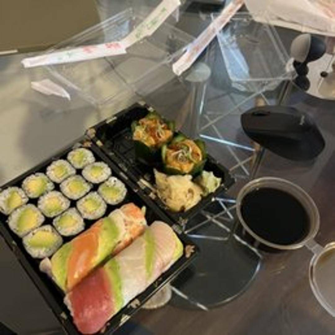 A visually appealing sushi roll with a California roll base, topped with an assortment of thinly sliced fish such as tuna, salmon, yellowtail, and avocado, resembling a rainbow.