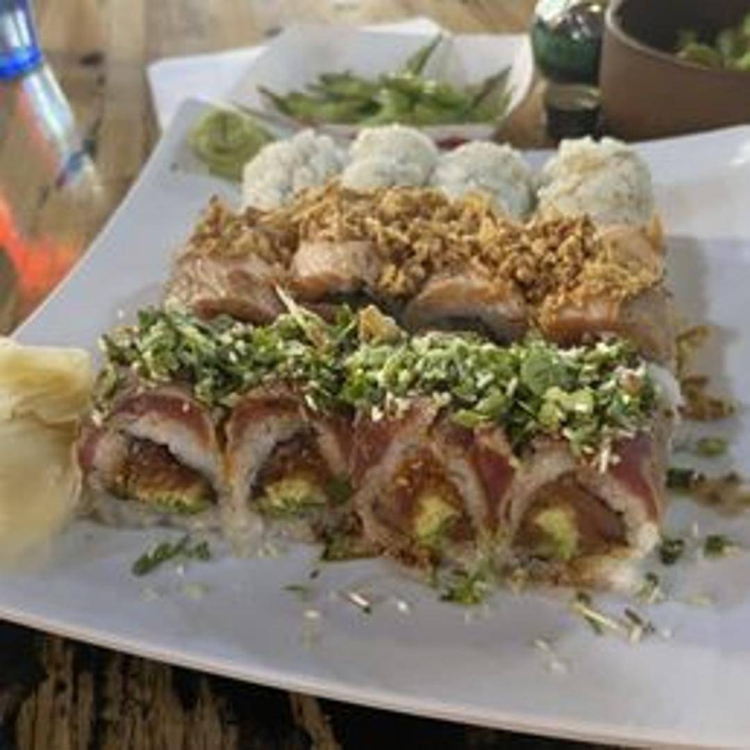 A sushi roll filled with finely chopped raw salmon, seasoned and mixed with complementary ingredients.