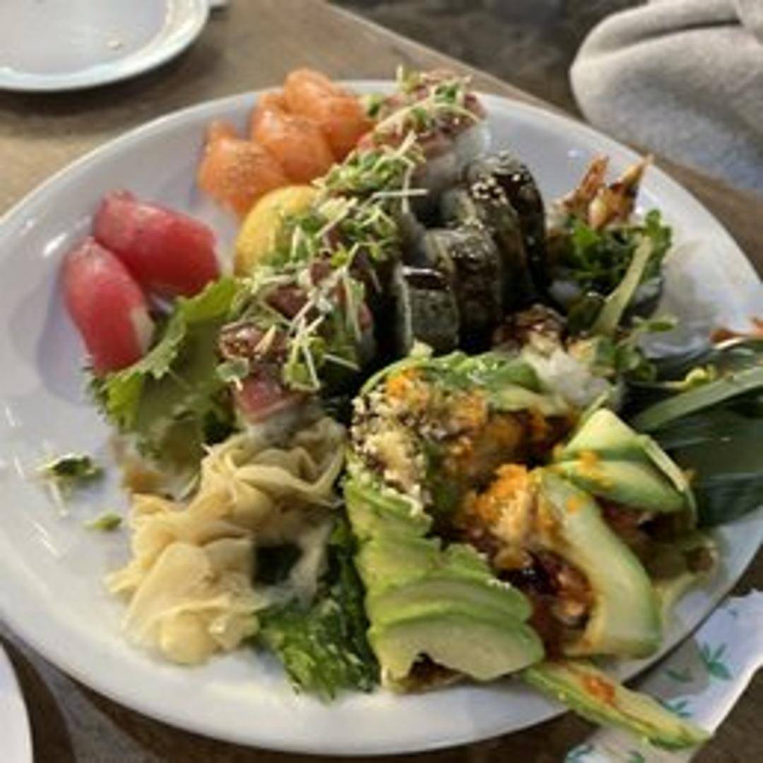 A signature sushi roll with a unique combination of ingredients, special to the restaurant.