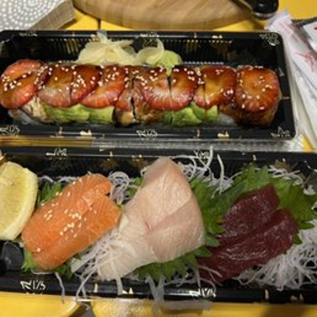 A special sushi roll, often featuring shrimp tempura, avocado, and a variety of toppings and sauces to resemble a dragon.