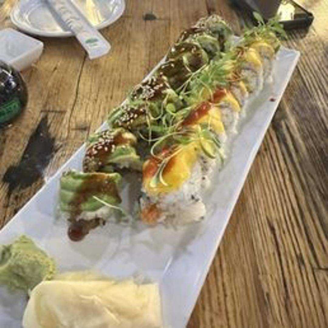 A sushi roll featuring mango, and other complementary ingredients, wrapped in seaweed and rice.