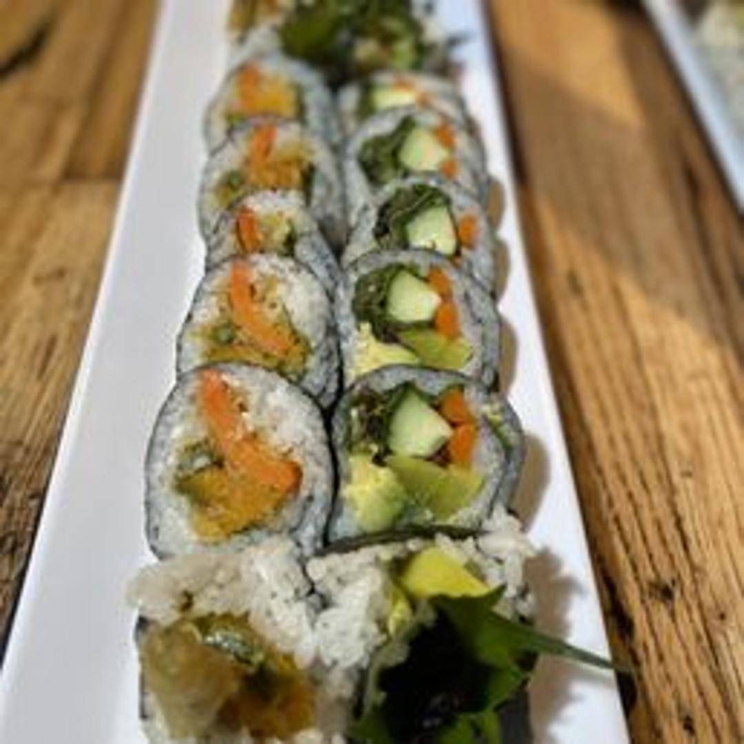A vegetarian sushi roll featuring a variety of fresh green vegetables wrapped in seaweed and rice.