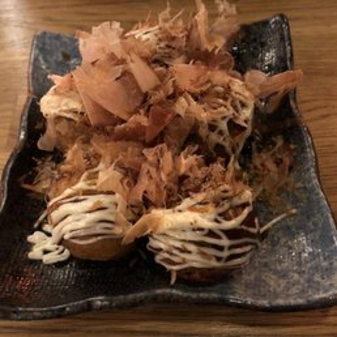 Popular Japanese street food featuring savory, spherical dough balls, filled with tender diced octopus, tempura scraps, pickled ginger, and green onion. Lightly crisp on the outside and soft on the inside, typically drizzled with takoyaki sauce, Japanese mayonnaise, and topped with bonito flakes and dried green laver.