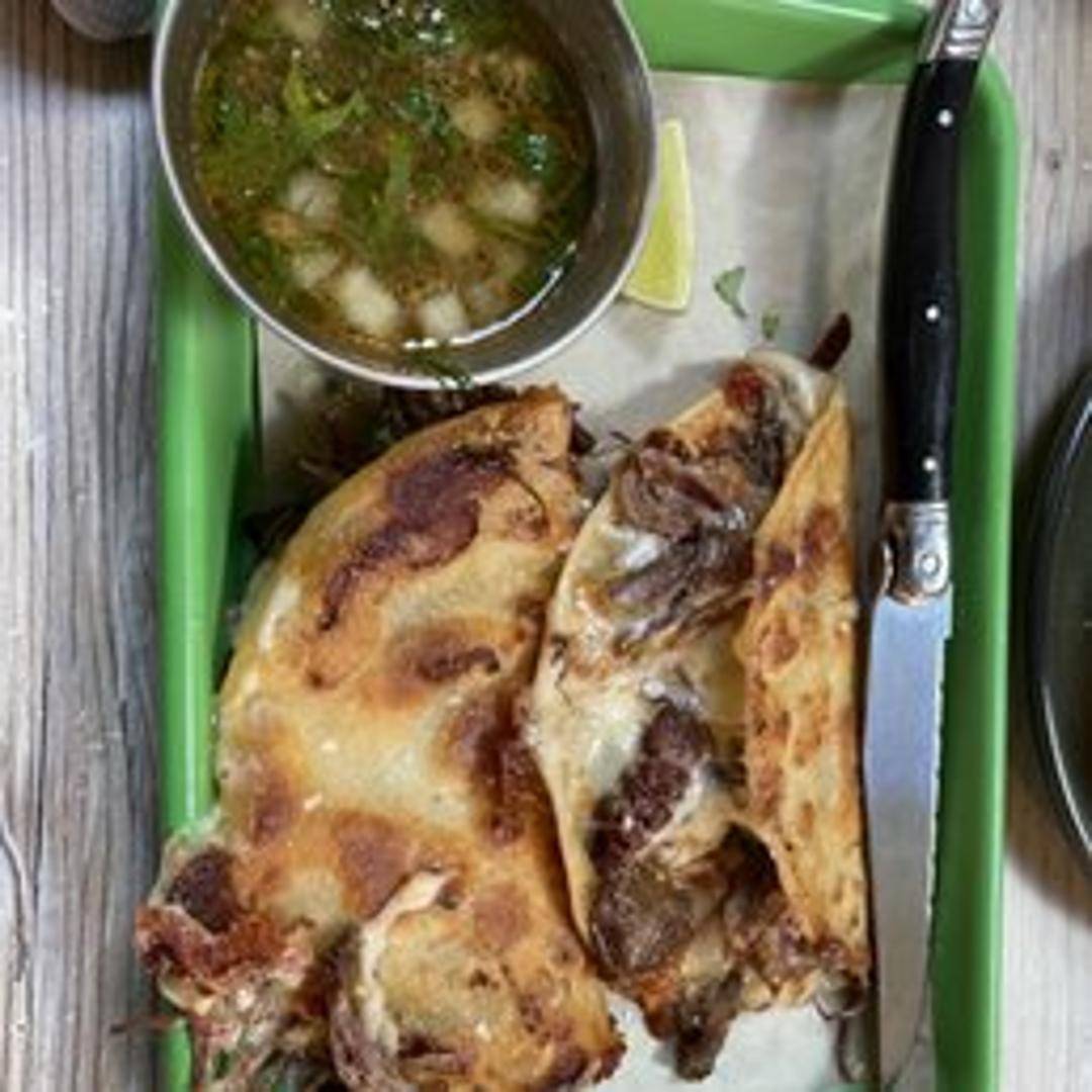 Tacos filled with tender, slow-braised short rib birria, a rich and savory stew, served with consommé for dipping.