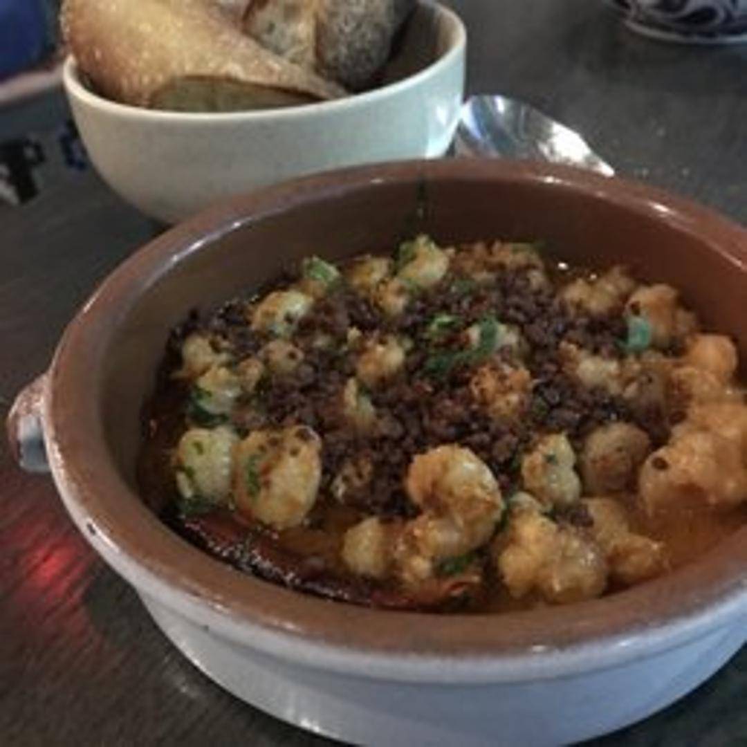 Sizzling Spanish garlic shrimp, a beloved classic. Succulent shrimp are quickly sautéed in olive oil with abundant garlic slices and often a touch of chili, creating an aromatic and intensely flavorful dish. Served piping hot, it's perfect for dipping with crusty bread.